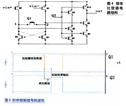 因前置放大器的增益與輸入電壓的乘積不足以達到輸出VOH的要求,所以把放大后的電壓再加到鎖存器上即可以得到所要求的電壓。第三級比較器的結構采用可再生比較器,它也是使用正反饋來實現兩個信號的比較。可再生比較器又稱為鎖存比較器。比較器中兩相非交疊時鐘控制,確定不同的工作模式,從而實現比較器的復位與輸出。其電路的拓撲結構如圖4所示。其中兩相非交疊時鐘Q1和Q2的波形如圖5所示。
