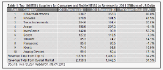 據(jù)IHS iSuppli公司的MEMS市場追蹤報告,2011年10大供應(yīng)商占消費與移動MEMS器件市場總體營業(yè)收入的86%,蘋果公司的主要供應(yīng)商意法半導(dǎo)體在該領(lǐng)域遙遙領(lǐng)先。