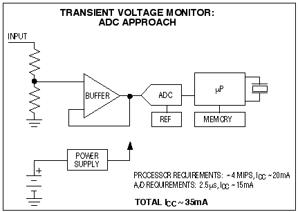 如果軟件比較具有高效編碼并且ADC無需處理器干預,系統每次采樣可執行少于10條指令,這就要求處理器具有4MIPS的能力。這種執行能力并不適合采用電池供電(圖1)。需要考慮用模擬方法對輸入瞬態偏離進行響應,用以替代連續跟蹤方案?! ?br />
