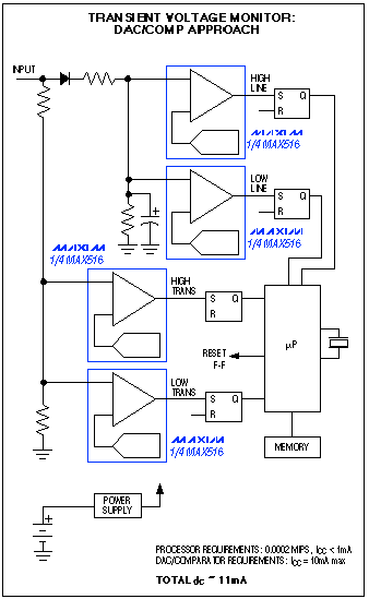 在這種情況下,DAC/比較器替代方案提供了幾個明顯優勢。需要4個DAC和4個比較器(或一片MAX516),后面連接一個4路設置/復位觸發器。一組DAC/比較器/FF監測高瞬態電壓,一組監測低瞬態電壓,一組用于監測電網跌落,一組用于監測浪涌(圖2)。瞬態電壓直接耦合到比較器,連接到電壓跌落和浪涌監測比較器的輸入首先要進行整流和濾波,以獲得電網電壓的平均值。可在軟件中調整到合適的rms.