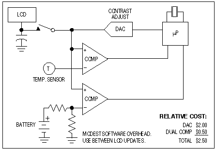 另外一種方法就是用一個低成本雙路DAC替代現有單路DAC.雙路DAC中的一路用于產生LCD對比度電壓,另一路用于構成ADC.無論單路還是雙路,都需要DAC和比較器支持快速、驅動DAC的簡單程序,以及對比較器采樣來實現逐次逼近(參見sidebar,逐次逼近)。