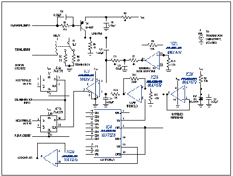 圖8中比較器(IC3)采用單電源供電、地電位檢測以及僅10ns傳輸延遲。DAC (IC4)為雙通道器件,一方面用于脈沖高度測量,另一方面驅動LCD對比度控制(如圖3)。注意DAC為反向驅動;電流輸出端連接在一起由經過緩沖的電壓基準驅動,基準輸入作為電壓輸出(每路帶有一個外部放大器緩沖)?! ?br />