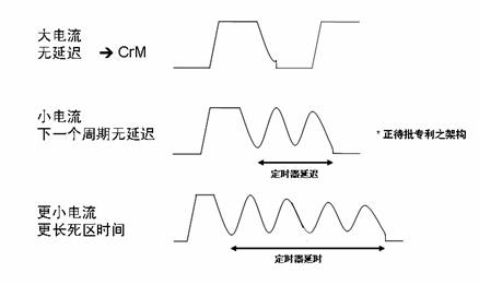 具體講,CCFF架構(gòu)具有固定導(dǎo)通時間控制和頻率反走特性。在大電流時,電路以臨界導(dǎo)電模式工作。小電流時(重負載時接近線路過零點,輕載時位于全部正弦方波),因此,磁芯復(fù)位后下一個周期并不會立即啟動;相反,定時器開始調(diào)節(jié)死區(qū)時間;電流越小,定時器持續(xù)時間(死區(qū)時間)越長;定時器持續(xù)時間取決于大小;定時器僅控制死區(qū)時間(不控制開關(guān)周期/關(guān)閉時間)。由于死區(qū)時間不受電流周期時長變化的影響,因此可以毫不猶豫地進行谷底導(dǎo)通。