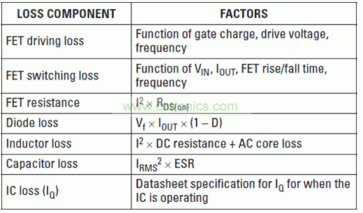 DC/DC轉(zhuǎn)換器的效率,是進(jìn)行電源設(shè)計(jì)時(shí)需要考慮的最重要屬性之一。低效率會(huì)轉(zhuǎn)換成高功耗,必須要在印刷電路板(PCB)上使用單獨(dú)的散熱器或者更多的銅,才能處理這些功耗。功耗也對(duì)電源上游器件提出了更高的要求。如表3所示,功耗共有幾個(gè)組成部分。