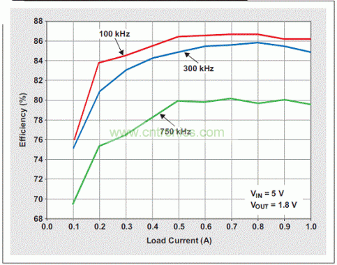 三個(gè)例子的重要損耗組成部分,來自于FET驅(qū)動(dòng)損耗、FET開關(guān)損耗和電感損耗。FET電阻和IC損耗是一致的,因?yàn)樗腥齻€(gè)設(shè)計(jì)中都使用了相同的IC。由于所有例子中都選擇了低ESR的陶瓷電容,因此電容損耗可以忽略不計(jì)。為了表明高頻開關(guān)的影響,我們對(duì)每個(gè)例子的效率都進(jìn)行了測量,并將其顯示在圖2中。該圖清楚地表明,效率隨開關(guān)頻率增加而下降。若想提高所有頻率下的效率,需要尋找到一種全負(fù)載狀態(tài)下低漏到源“導(dǎo)通”電阻、低門電荷或者低靜態(tài)電流規(guī)范的DC/DC轉(zhuǎn)換器;或者尋找到一些具有更低等效電阻的電容和電感。