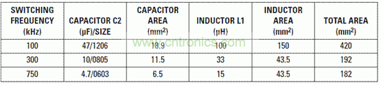 表4列出了三種設(shè)計(jì)要求的總電路板面積,以及電容和電感的焊盤面積。電容或者電感的建議焊盤面積,稍稍大于單個(gè)組件本身,且三種設(shè)計(jì)舉例均使用了該面積。每個(gè)組件占用的面積相加(其包括IC、濾波器以及所有其它小型電阻器和電容的焊盤尺寸),然后將得到的結(jié)果乘以2倍(考慮到組件的間距),便得到總面積。100-kHz和750-kHz設(shè)計(jì)之間存在近250 mm2的總面積節(jié)省,從而使濾波器體積縮小50%,而板空間占用減少55%。但是,存在收益遞減規(guī)律,因?yàn)殡娙莺碗姼兄禑o法減少至零!換句話說,不斷推高頻率并不能夠一直減小總尺寸,因?yàn)槟銦o法總是能夠在市場上買到這些尺寸適合且批量生產(chǎn)的電感和電容。注意,33-µH和15-µH電感占用相同的面積。存在這種可能性,是因?yàn)?3-µH電感的高度為3.5 mm,而15-µH電感僅高2.4 mm。我們想通過這兩種電感來說明的觀點(diǎn)是:電感與體積成正比例關(guān)系。