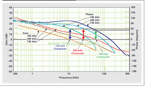 圖 3 100kHz、300 kHz和750 kHz 的波特圖