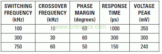 瞬態(tài)響應(yīng)是電源性能級(jí)別的一個(gè)較好指標(biāo)。我們利用每種電源的波特圖來表明高開關(guān)頻率的對(duì)比情況(參見圖3)。如圖所示,每個(gè)電源的相位裕度在45°和55°之間,其表明瞬態(tài)響應(yīng)得到較好的抑制。交叉頻率約為開關(guān)頻率的1/8。使用快速開關(guān)DC/DC轉(zhuǎn)換器時(shí),設(shè)計(jì)人員應(yīng)確保電源IC誤差放大器具有足夠的帶寬來支持高交叉頻率。TPS54160誤差放大器的單位增益頻寬一般為2.7 MHz。表5顯示了實(shí)際瞬態(tài)響應(yīng)時(shí)間以及電壓峰值過沖的相關(guān)值。開關(guān)頻率越高,過沖值便越是更低,原因是更寬的帶寬。