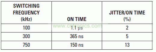 高轉(zhuǎn)換比和更高頻率時(shí),會(huì)存在噪聲問題。當(dāng)選擇某個(gè)高開關(guān)頻率時(shí),設(shè)計(jì)人員應(yīng)考慮抖動(dòng)和DC/DC轉(zhuǎn)換器的最小“導(dǎo)通”時(shí)間。當(dāng)占空比較小時(shí),抖動(dòng)噪聲便為開關(guān)脈沖的更大百分比。表6顯示了48-V到5-V轉(zhuǎn)換比時(shí),抖動(dòng)與“導(dǎo)通”時(shí)間之比。我們假設(shè),在該相位節(jié)點(diǎn)上存在0.5-V二極管壓降和20-ns抖動(dòng)。
