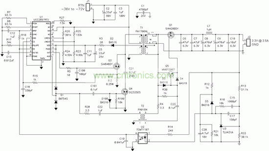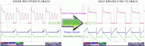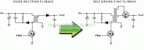 在自驅(qū)動同步反向電源中,輸出二極管被一個 N 通道 MOSFET 代替,同時必須向電源變壓器添加一個繞組以生成同步柵極驅(qū)動信號。相比輸出二極管整流器,該同步MOSFET的低導(dǎo)通電阻可帶來更低的傳導(dǎo)損耗,這就極大地提高了高負(fù)載電流時的效率。