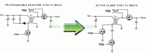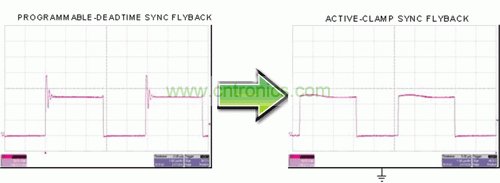 圖 4 描述了如何進(jìn)一步提高效率并利用同步 MOSFET 柵極驅(qū)動信號來控制一個有源主緩沖器。這種結(jié)構(gòu)通常被稱為有源鉗位反向結(jié)構(gòu)。在前面示意圖中,我們已經(jīng)使用 RCD 緩沖器來降低一次側(cè) MOSFET 漏-源-電壓的電壓峰值。該電壓峰值出現(xiàn)在一次側(cè) MOSFET 關(guān)閉時,這主要是由于變壓器主繞組的泄露能量造成的。RCD 緩沖器消耗了其緩沖器電阻中的這種能量。在有源鉗位反向結(jié)構(gòu)中,泄露能量由鉗位電容捕獲,并被帶至負(fù)載再循環(huán),最后返回到輸入。這就構(gòu)成了一個實際上無損耗的緩沖器。RCD 緩沖器的漏-源極-電壓波形和一個有源鉗位的對比關(guān)系如圖 5 所示。該有源鉗位消除了高頻峰值。除消除漏能損耗以外,開關(guān)損耗和 EMI 也得到了極大降低。在許多情況下,這種有源鉗位緩沖器允許使用低漏-源-電壓額定值的一次側(cè) MOSFET,從而進(jìn)一步降低了損耗,并有可能降低 MOSFET 的成本。