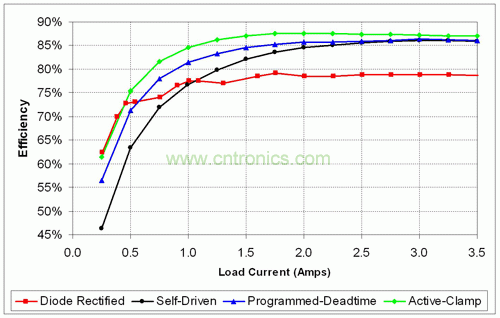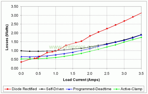 圖 6 顯示了每次二極管整流反向結(jié)構(gòu)升級對實際設(shè)計效率的提升程度。電源將一個遠(yuǎn)距通信 48VDC 輸入轉(zhuǎn)換為一個 3.5A 最大負(fù)載電流的 3.3V 輸出。將一個二極管整流器轉(zhuǎn)換為一個自驅(qū)動同步反向結(jié)構(gòu)使最大負(fù)載效率提高超過 7%,但也確實降低了 1A 以下輸出電流的輕負(fù)載效率。這是由于同步 MOSFET 帶來了柵極驅(qū)動損耗、開關(guān)損耗和直通損耗。如圖 7 所示,輕負(fù)載狀態(tài)下這些損耗在總損耗中占較大百分比,從而降低了輕負(fù)載的效率。使用可編程延遲消除了直通損耗,從而極大地提高了輕負(fù)載的效率,如圖 7 所示。由于其他電路損耗在同步 MOSFET 損耗中占主導(dǎo)地位,因此滿負(fù)載效率保持基本不變。最終,有源鉗位的實施提高了所有負(fù)載條件下 3.3V 電源的效率。