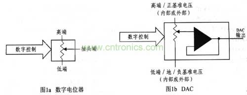 利用數(shù)字輸入控制微調(diào)模擬輸出有兩種選擇:數(shù)字電位器和數(shù)/模轉(zhuǎn)換器(DAC),兩者均采用數(shù)字輸入控制模擬輸出。通過數(shù)字電位器可以調(diào)整模擬電壓;通過DAC既可以調(diào)整電流,也可以調(diào)整電壓。電位器有三個(gè)模擬連接端:高端、抽頭端(或模擬輸出)和低端(見圖1a)。DAC具有隊(duì)?wèi)?yīng)的三個(gè)端點(diǎn):高端對(duì)應(yīng)于正基準(zhǔn)電壓,抽頭端對(duì)應(yīng)于DAC輸出,低端則可能對(duì)應(yīng)于接地端或負(fù)基準(zhǔn)電壓端(見圖1b)。