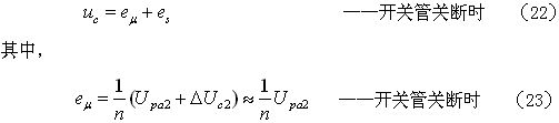 值得注意的是,當電源開關管Q1關斷時,由于變壓器次級線圈整流濾波電路D2和C2的接入,開關變壓器初、次級線圈的等效分布電容Cs相對于濾波電容C2來說,其作用將變得微不足道;此時,由于輸出電壓Uo通過變壓器初、次級線圈的耦合和反射作用,使得變壓器初級線圈產生的反電動勢電壓