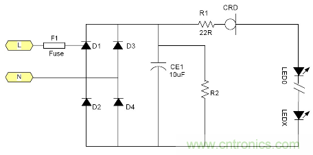 由于恒流二極管需要一定的電壓Vk才能夠進(jìn)入恒流, 所以太低的電源電壓是無(wú)法工作的。通常這個(gè)Vk大約在5-10V左右 所以大多數(shù)采用電池供電的LED是無(wú)法工作的, 最大電流由于恒流二極管的功耗受到限制, 所以過(guò)大的電流也是不合適的。例如1W的LED通常需要350mA, 恒流二極管就很難提供, 目前比較合適的使用場(chǎng)合就是交流市電供電的LED燈具采用很多小功率LED串聯(lián)也就是高壓小電流的情況是最為合適;但是由于恒流二極管的耐壓有一定的限制 所以它所能吸收的電源電壓變化也是有限的。就拿100V耐壓的CRD來(lái)說(shuō)用在220V市電電源里都還只能對(duì)付有限的電壓變化。220V經(jīng)過(guò)橋式整流以后它的輸出直流電壓大約為264V.如果市電變化+10% ~-15%就相當(dāng)于整流后為290~187V, 電壓變化103V.已經(jīng)超過(guò)其耐壓了。因?yàn)長(zhǎng)ED伏安特性的非線(xiàn)性 所以很難用公式來(lái)表示。總之當(dāng)市電電壓降低時(shí)LED中的電流就會(huì)隨市電電壓的降低而降低。其亮度也會(huì)跟著變。 典型應(yīng)用電路中圖3為典型的應(yīng)用電路, 圖4為加了阻容降壓的應(yīng)用電路為了應(yīng)對(duì)低電壓的輸出場(chǎng)合。
