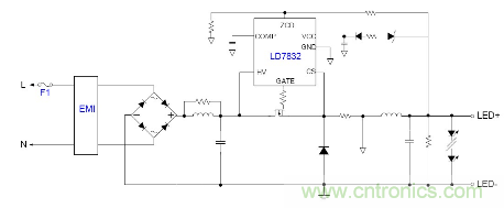 隨著目前法規(guī)和能效的需求, 針對(duì)LED應(yīng)用提出高PF以及適應(yīng)全電壓范圍都能可靠工作的要求, 并且朝小型化方面發(fā)展, 因此之前的填谷式的PFC電路也需要增加兩個(gè)高壓電容因體積的限制不太適合應(yīng)用。有鑒如此, 國(guó)內(nèi)外很多廠商都推出了適應(yīng)球泡燈和T管之類(lèi)的非隔離電源應(yīng)用驅(qū)動(dòng)方案, 下面就以通嘉科技的LD7832做為典型介紹。