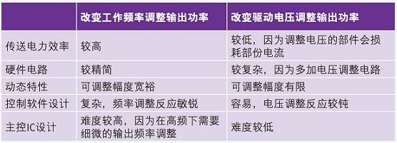 在諧振系統中調整功率的方式另外還有改變線圈上的電感值或電容值的方法,但在實際量產上并不容易完成所以不被采用。在圖(五)是無線充電聯盟規格書中所提的兩種控制發射線圈輸出功率的方法,第一種是變頻調整式,另一種則是變壓調整式。