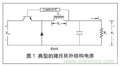 圖1所示為一個降壓拓撲結構電源的架構,該構架廣泛應用于輸出電壓小于輸入電壓的系統。在典型的降壓拓撲結構電路中,當開關(Q1)閉合時,電流開始通過這個開關流向輸出端,并以某一速率穩步增大,增加速率取決于電路電感。根據楞次定律,di=E*dt/L,流過電感器的電流所發生的變化量等于電壓乘以時間變化量,再除以這個電感值。由于流過負載電阻RL的電流穩定增加,輸出電壓成正比增大。