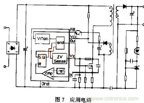 由(9),(10)或可知,調(diào)節(jié)輸出功率、穩(wěn)定輸出電壓可以調(diào)節(jié)導(dǎo)通時(shí)間或占空比或調(diào)頻方式或幾種方式綜合應(yīng)用。當(dāng)輸出功率下降或電源電壓上升,導(dǎo)通時(shí)間減小,反之導(dǎo)通時(shí)間增加;隨輸出功率的增加或減小變壓器初次級(jí)電流峰值均增加或減小,由式(3)可知變壓器的釋放儲(chǔ)能時(shí)間也隨之增加或減少,為實(shí)現(xiàn)“零電壓”開(kāi)關(guān),變壓器不能工作在間歇狀態(tài),因此F%IM控制方式不能滿(mǎn)足本文電路的“零電壓”開(kāi)通的要求。基于上述工作條件的約束,本文電路應(yīng)采用輸出電壓反饋控制導(dǎo)通時(shí)間,用“零電壓”檢測(cè)控制開(kāi)關(guān)管導(dǎo)通時(shí)刻,即調(diào)頻、調(diào)占空比工作方式。具體電路可以采用通用器件組合,如圖7。