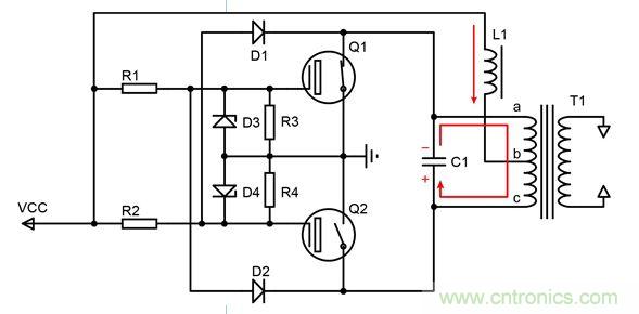 7.      (圖3)由于T1對C1的持續充電,C1上電壓為a正c負,通過兩個二極管使Q2柵極電壓升高,Q1柵極逐漸下降,同時正反饋形成,Q2導通,Q1截止。