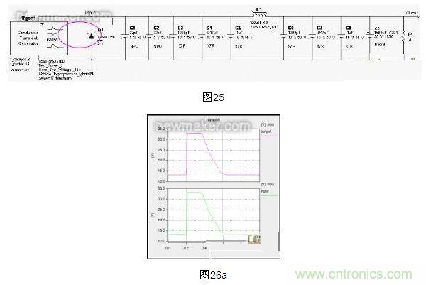 在ISO 7637-2:2004、GMW3100-08.2001:3.2.1.3等標準中規(guī)定了沿電源線的電瞬態(tài)傳導(dǎo)的干擾脈沖的抗擾性失效模式、嚴重程度和測量,提供了5 種典型脈沖波形,雖然沒有涵蓋所有可能出現(xiàn)在車輛上的各種瞬態(tài)脈沖,但適用于各種動力系統(tǒng)的道路車輛,例如:火花點火發(fā)動機、壓燃式發(fā)動機、電動機、混合動力驅(qū)動系統(tǒng)。針對這5種典型的瞬態(tài)傳導(dǎo)脈沖,在Saber仿真環(huán)境中進行該電源濾波器電路(圖13)的仿真如下: