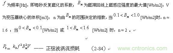 當加到變壓器初級線圈兩端的電壓為正弦波時,變壓器鐵芯的磁滯損耗和渦流損耗可分別用下面的(2-83)和(2-84)經驗公式進行估算: