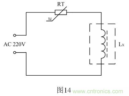 開關變壓器退磁的最好的方法是讓開關變壓器初級線圈在非常短的時間內通過一個幅度為3~5倍Imax(極限電流)的阻尼振蕩電流。因此,可用一個20~40歐姆的消磁熱敏電阻(可用兩個消磁熱敏電阻串聯)與開關變壓器的初級線圈串聯,然后接到110~220V/50Hz交流電源上,大約只需要20多秒鐘,待消磁熱敏電阻完全加熱后,即可達到退磁的目的,如圖14所示。在圖14中,RT為熱敏電阻,Lx為開關變壓器的初級線圈。