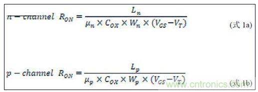 在VIN為各種電平條件下,p溝道和n溝道RON的并聯(lián)值形成并聯(lián)結(jié)構(gòu)的RON特征(圖2)。RON隨VIN的變化曲線在不考慮溫度、電源電壓和模擬輸入電壓對RON影響的情況下為直線。為使信號損耗和傳輸延遲最小,理想情況下的RON應(yīng)盡量小。然而,降低RON將增大MOSFET硅片的寬度/長度(W/L)比,從而造成較高的寄生電容和較大的硅片面積。這種較大的寄生電容降低模擬開關(guān)的帶寬。如果不考慮W和L,RON是電子和空穴遷移率(μn和μp)、氧化物電容(COX)、門限電壓(VT)及信號電壓、n溝道及p溝道MOSFET的信號電壓VGS (VIN)的復(fù)合函數(shù),如式1a和1b所示。