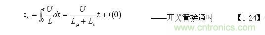 假設(shè)變壓器初級線圈的等效電感為L,L=Lu+Ls ,當(dāng)電源開關(guān)管Q1接通時,流過變壓器初級線圈的電流為: