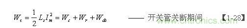 【1-28】式中,Wc 為電源開關(guān)管由導(dǎo)通到完全關(guān)斷期間電容器C儲存的能量, Wr為電源開關(guān)管由導(dǎo)通到完全關(guān)斷期間電阻R損耗的能量,Wds 為電源開關(guān)管由導(dǎo)通到完全關(guān)斷期間漏極電流(逐步減小)對電容器C充電產(chǎn)生分流作用所做的功。