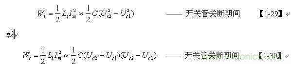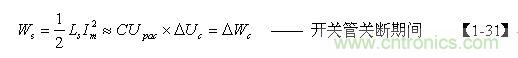 如果不考慮電阻R對電容器C充電時產(chǎn)生的分流作用,以及開關(guān)管由導(dǎo)通到完全關(guān)斷期間漏極電流(逐步減小)對電容器C充電時產(chǎn)生的分流作用,即:Wr=0 、Wds=0 ,則【1-28】式可以改寫為: