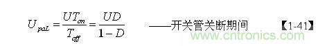 【1-41】式中,U為電源輸入電壓,Ton為電源開關(guān)管的導(dǎo)通時間,Toff為電源開關(guān)管的關(guān)斷時間,D為占空比。而Upau可根據(jù)漏感Ls 與開關(guān)變壓器初級線圈的電感L的比值k求得。