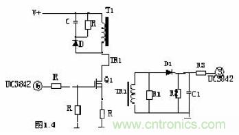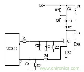 R4、C3、R5、R6、C4、D1、D2組成緩沖器,和開(kāi)關(guān)MOS管并接,使開(kāi)關(guān)管電壓應(yīng)力減少,EMI減少,不發(fā)生二次擊穿。在開(kāi)關(guān)管Q1關(guān)斷時(shí),變壓器的原邊線圈易產(chǎn)生尖峰電壓和尖峰電流,這些元件組合一起,能很好地吸收尖峰電壓和電流。從R3測(cè)得的電流峰值信號(hào)參與當(dāng)前工作周波的占空比控制,因此是當(dāng)前工作周波的電流限制。當(dāng)R5上的電壓達(dá)到1V時(shí),UC3842停止工作,開(kāi)關(guān)管Q1立即關(guān)斷。