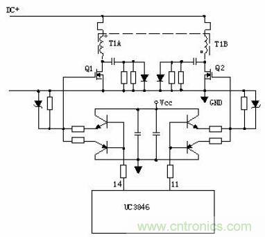 5、有驅(qū)動(dòng)變壓器的功率變換電路:T2為驅(qū)動(dòng)變壓器,T1為開(kāi)關(guān)變壓器,TR1為電流環(huán)。