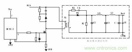 T1為開(kāi)關(guān)變壓器,其初極和次極的相位同相。D1為整流二極管,D2為續(xù)流二極管,R1、C1、R2、C2為削尖峰電路。L1為續(xù)流電感,C4、L2、C5組成π型濾波器。