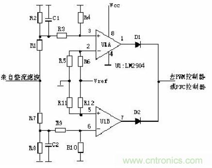 取樣電壓分為兩路,一路經(jīng)R1、R2、R3、R4分壓后輸入比較器3腳,如取樣電壓高于2腳基準(zhǔn)電壓,比較器1腳輸出高電平去控制主控制器使其關(guān)斷,電源無(wú)輸出。另一路經(jīng)R7、R8、R9、R10分壓后輸入比較器6腳,如取樣電壓低于5腳基準(zhǔn)電壓,比較器7腳輸出高電平去控制主控制器使其關(guān)斷,電源無(wú)輸出。