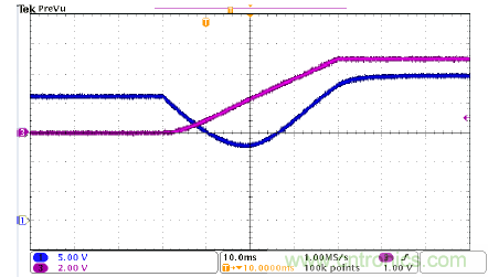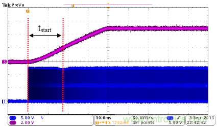 圖4是UCC28700的啟動(dòng)波形,CH1是MOSFET柵極驅(qū)動(dòng)信號(hào),CH3是輸出電壓。該器件啟動(dòng)順暢,沒有過沖和聲頻噪聲。該圖顯示,UCC28700器件有非常好的啟動(dòng)性能。在圖4中,tstart接近18ms,與計(jì)算結(jié)果吻合。