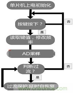 軟件結(jié)構(gòu)框圖如圖1,主程序框圖如圖3。程序執(zhí)行的流程如下所述:單片機(jī)上電之后,系統(tǒng)進(jìn)行按鍵、片上ADC12和LCD顯示屏初始化,程序查詢按鍵,若有相應(yīng)按鍵按下,修改正弦波頻率,然后AD采樣電流判斷是否過流;否則返回繼續(xù)查詢按鍵。如果輸出過流,程序?qū)㈥P(guān)閉SPWM輸出,延時自恢復(fù);否則返回按鍵查詢。