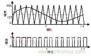 本系統(tǒng)采用自然采樣法產(chǎn)生SPWM波,以正弦波為調(diào)制波,等腰三角波為載波進(jìn)行比較,在兩個波形的自然交點時刻控制開關(guān)器件的通斷。其優(yōu)點是所得SPWM波形最接近正弦波,但由于三角波與正弦波交點有任意性,脈沖中心在一個周期內(nèi)不等距,從而脈寬表達(dá)式是一個超越方程,若采用實時計算的方式得到SPWM波的話,計算繁瑣,非MSP430所能勝任。本系統(tǒng)充分利用MSP430的定時器,搭建了一個簡易的DDS;讓其計數(shù)器作增減計數(shù)構(gòu)成三角波載波,再把正弦波表作為數(shù)組預(yù)先存入MSP430中,我們只需在定時器中斷中更新比較寄存器數(shù)值即可得到調(diào)制正弦波。由于MSP430定時器自帶比較功能,兩者比較即可得到SPWM波輸出,繼而撇開了繁瑣的超越方程求解。最終我們利用此方法得到的SPWM波濾波后的正弦波失真度達(dá)到了0.5%。圖4是自然采樣原理圖。