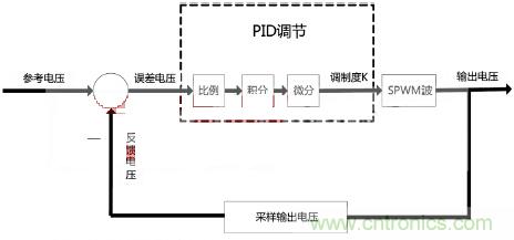 由于輸入電壓隨著負(fù)載變大會有降低,切系統(tǒng)濾波電感具有電阻成分,這些因素導(dǎo)致在系統(tǒng)開環(huán)下負(fù)載調(diào)整率較大,因此本系統(tǒng)采用閉環(huán)反饋調(diào)整輸出電壓穩(wěn)定在10V。我們選用經(jīng)典PID反饋調(diào)整,對輸出電壓進(jìn)行采樣,與參考電壓比較得到誤差電壓后進(jìn)行位移式PID調(diào)節(jié),PID運(yùn)算輸出作為SPWM的調(diào)制度K,與正弦波表相乘后形成新的波表進(jìn)行生成SPWM波運(yùn)算。用此方法后負(fù)載調(diào)整率降到了1%以下,圖5是反饋過程框圖。