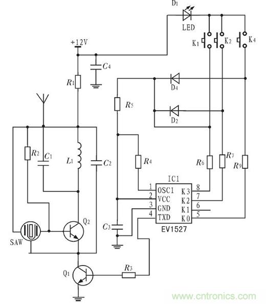 發(fā)送模塊主要由HS1527($1056.0000)無(wú)線發(fā)碼芯片、聲表面濾波器、指示燈及濾波電路等組成,發(fā)送模塊作為遙控器來(lái)操作,電路圖如圖2所示。當(dāng)按下不同的按鍵K時(shí),發(fā)碼芯片就會(huì)通過(guò)天線發(fā)出不同的編碼,編碼經(jīng)過(guò)天線發(fā)送到接收模塊由接收模塊將編碼交由控制模塊解析處理,發(fā)送模塊供電電壓12 V,由電池供電。