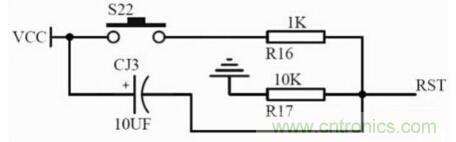 (2)按鍵復位:按鍵復位就是在復位電容上并聯一個開關,當開關按下時電容被放電、RST也被拉到高電平,而且由于電容的充電,會保持一段時間的高電平來使單片機復位。