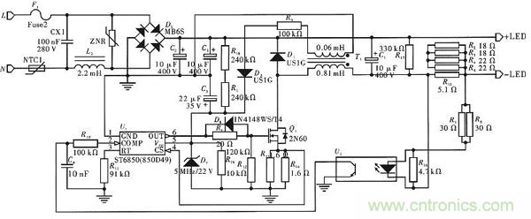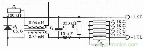 如圖2所示,此電路通過變壓器輸出適當(dāng)?shù)碾娏鳎?dāng)有LED負(fù)載時(shí),電路中通入適當(dāng)?shù)碾娏骱皖l率使LED正常工作;當(dāng)沒有負(fù)載時(shí),變壓器中仍然殘留有能量,需要釋放。此時(shí)由R17等構(gòu)成的回路,可以慢慢地釋放變壓器中的電能。但當(dāng)電流突然減小時(shí),變壓器中會(huì)產(chǎn)生感應(yīng)電動(dòng)勢,由此會(huì)產(chǎn)生較高的反向電壓,可能會(huì)擊穿器件。為了克服這個(gè)問題,在線圈的兩端并聯(lián)一個(gè)續(xù)流二極管D1,同時(shí)在電路輸出端串聯(lián)R15,并且在R15兩端并聯(lián)R2,R3,R4,R6。R15有降壓作用,并且能為反饋電路提供電壓。由于R15承受的功率較大,容易燒壞,所以預(yù)備一個(gè)由R2,R3,R4和R6的并聯(lián)等效電阻,這樣每個(gè)電阻承受的功率變小,在增加使用壽命的同時(shí),能夠減少維修費(fèi)用。