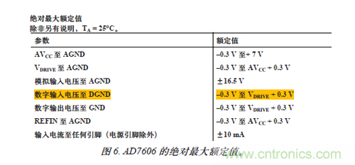 過沖和欠沖可能損壞輸入保護電路,或者縮短IC 的使用壽命。圖6 所示為 AD7606 的絕對最大額定值。數字輸入電壓應在–0.3 V 和VDRIVE + 0.3 V 之間。另外,如果振鈴高于最大VIL 或小于最小VIH 可能導致邏輯誤差。