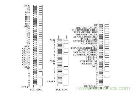 從圖4可見:89C51與MAX1647通信的開始條件是SDA端口為下降沿,同時SCL端口為高電平;MAX1647的 WRITE-WORD協議為0b00010010(0b表示二進制),或者可表示為0x12(0x表示十六進制);READ-WORD協議則可表示為 0b00010011或者0x13。另外,CMD0~CMD7代表具體的命令,D0~D15表示數據位。幾個常用的WRITE-WORD協議命令:ChargerMode()命令,命令代碼為0x12,主要用于清零和復位;ChargingVolage()命令,命令代碼為0x15,主要用于電壓預置;ChargingCurrent()命令,主要用于電流預置,命令代碼為0x14,即CMD7~CMD0的數據為00010100,16位二進制數值由D15~D0組成表示Io的電流值,單位為mA。當端子SEL與AGND短接時,電流Io的最大預置值為1.023A;如果讓端子SEL懸空,則 Io的最大預置值為2.047A;當端子SEL與VL短接,則Io的最大預置值為4.095A。MAX1647提供兩個電流源給負載供電:一個來自內部的線性電流源IOUT,一個是開關電路提供的電流。IOUT提供1mA~31mA的電流(步長為1mA)。例如,當Io最大預置值為4.095A時,數據位 D11~D6對應為6位電流預置DAC的DA5~DA0位;數據位D4~D0對應輸出電流IOUT的I4~I0,表示IOUT線性電流源二進調整數。注意任何時候DAC位被置位,線性電流源被調整至滿幅(31mA)。AlarmWarning()命令,命令代碼為0x16,主要用于保護設置;ChargerStatus()命令,命令代碼為0x13,主要用于返回溫度傳感器以及MAX1647的內部信息,這些信息暫存D15~D0位中。