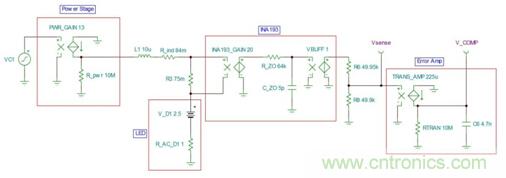 圖2是仿真控制回路的圖1的簡單SPICE模型。VC1是COMP引腳上的電壓,直接驅動跨導增益為13的功率級(控制器更多的內部細節(jié)請參見TPS54218數(shù)據(jù)表內的圖31)。這個電流通過電感器和感測電阻器來直接驅動LED。需要注意的是,電感值和LED值的變化不會對響應產生影響,這是因為電感器中的電流受到了控制。