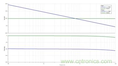 外部補償組件C6從這個點 (V_COMP) 上接地。需要注意的是,V_COMP也是我們回路仿真的起始點 (VC1)。回路增益是V_COMP引腳上測得的電壓除以VC1上的注入擾動。所以,通過將VC1設定為1 Vac信號,回路增益最終就是V_COMP上測得的電壓。