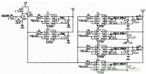 選用東芝半導(dǎo)體公司生產(chǎn)的高速光耦隔離型IGBT/MOSFET驅(qū)動芯片TLP250.TLP250具有隔離電壓高、驅(qū)動能力強(qiáng)、開關(guān)速度快等特點(diǎn)。驅(qū)動電路的原理圖如圖3所示。
