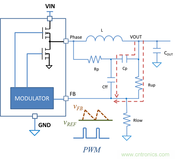 與傳統(tǒng)電壓模式或電流模式控制架構(gòu)不同的是,DCAPx控制系統(tǒng)擁有兩條直接輸出反饋路徑:一條通過(guò)反饋電阻器分壓器網(wǎng)絡(luò),另一條則通過(guò)直流電阻(DCR)注入電路,如圖2所示。DCAPx控制系統(tǒng)并無(wú)傳統(tǒng)II型或III型補(bǔ)償器那樣的大直流電(DC)流增益誤差放大器。在FB引腳處調(diào)制PWM脈沖。FB引腳通常是傳統(tǒng)控制架構(gòu)的誤差放大器負(fù)輸入端。對(duì)于DCAP、DCAP2、DCAP3,它是PWM比較器的一個(gè)輸入端。