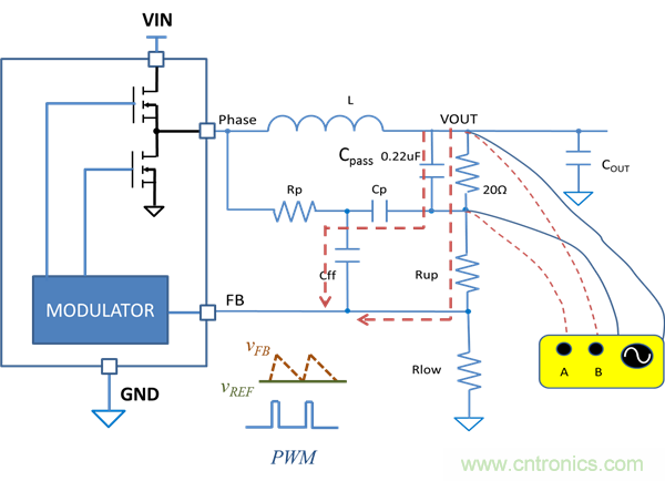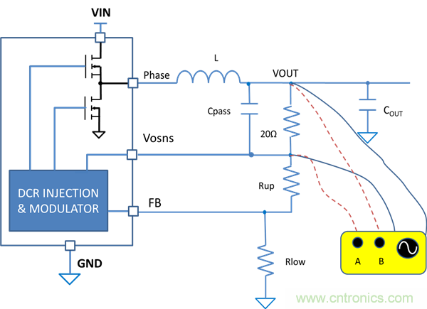 為了保持準(zhǔn)確度,將一個(gè)旁路電容器(Cpass)并聯(lián)添加到20Ω的電阻器。這個(gè)20Ω的電阻器和Cpass形成了一個(gè)高通濾波器。轉(zhuǎn)角頻率設(shè)置得比轉(zhuǎn)換器開(kāi)關(guān)頻率的一半還低,以便FB引腳處的三角波形在測(cè)試過(guò)程中與在正常運(yùn)行期間基本相似。